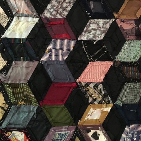 The tumbling blocks were pieced but not quilted. That made them even more intriguing because details of the hand work were still visible on the back that would have been hidden had this been a finished quilt. Spot the playing cards Myrtie used as templates!